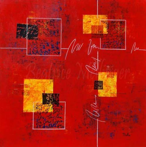 This series was inspired by the poem “Voyelles” written in 1871 by the French poet Arthur Rimbaud, in which each vowel is assigned a color. For each letter I created one painting (actually two series) in which I tried to reflect the associations established by the Poet, while adding my own interpretation. Abstract calligraphy was introduced as a tribute to poetry and to render the rhythm of writing, while white lines are suggesting the poem's structure. The strongest analogies within the poem have been transferred into the painting such as, “I, Pourpre Sang Craché”, “A, Noir Corset velu des Mouches”. The techniques used were painting, collage, transfers, and material: acrylic paint, acrylic fluids, water-soluble wax pastels, ink and metal leafs.
